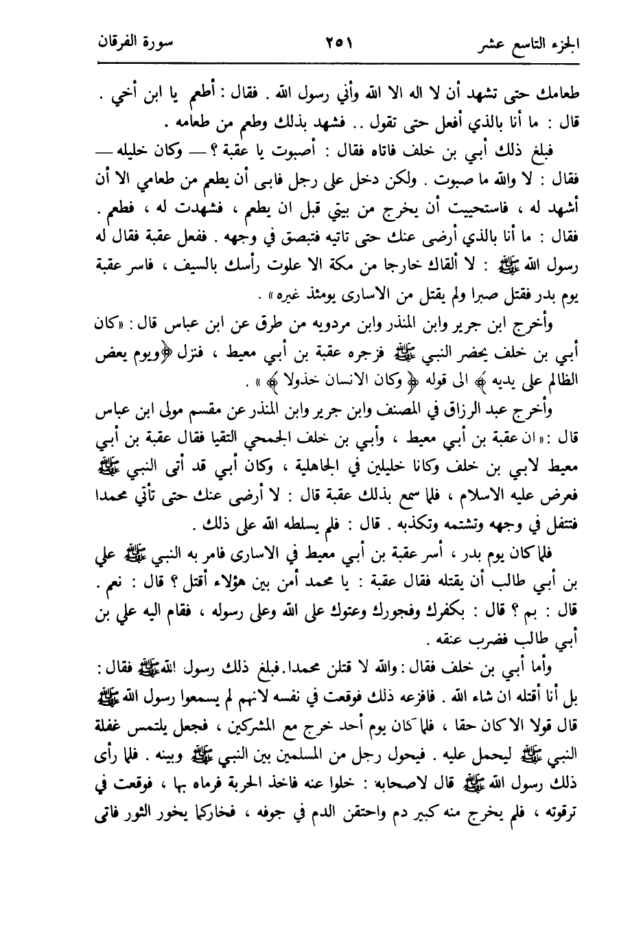 وَأخرج عبد الرَّزَّاق فِي المُصَنّف وَابْن جرير وَابْن الْمُنْذر عَن مقسم مولى ابْن عَبَّاس قَالَ: إِن عقبَة بن أبي معيط وَأبي بن خلف الجُمَحِي التقيا فَقَالَ عقبَة بن أبي معيط لأبي بن خلف وَكَانَا خليلين فِي الْجَاهِلِيَّة وَكَانَ أبي قد أَتَى النَّبِي صلى الله عَلَيْهِ وَسلم فَعرض عَلَيْهِ الإِسلام فَلَمَّا سمع بذلك عقبَة قَالَ: لَا أرْضى عَنْك حَتَّى تَأتي مُحَمَّدًا فتتفل فِي وَجهه وتشمته وَتكَذبه