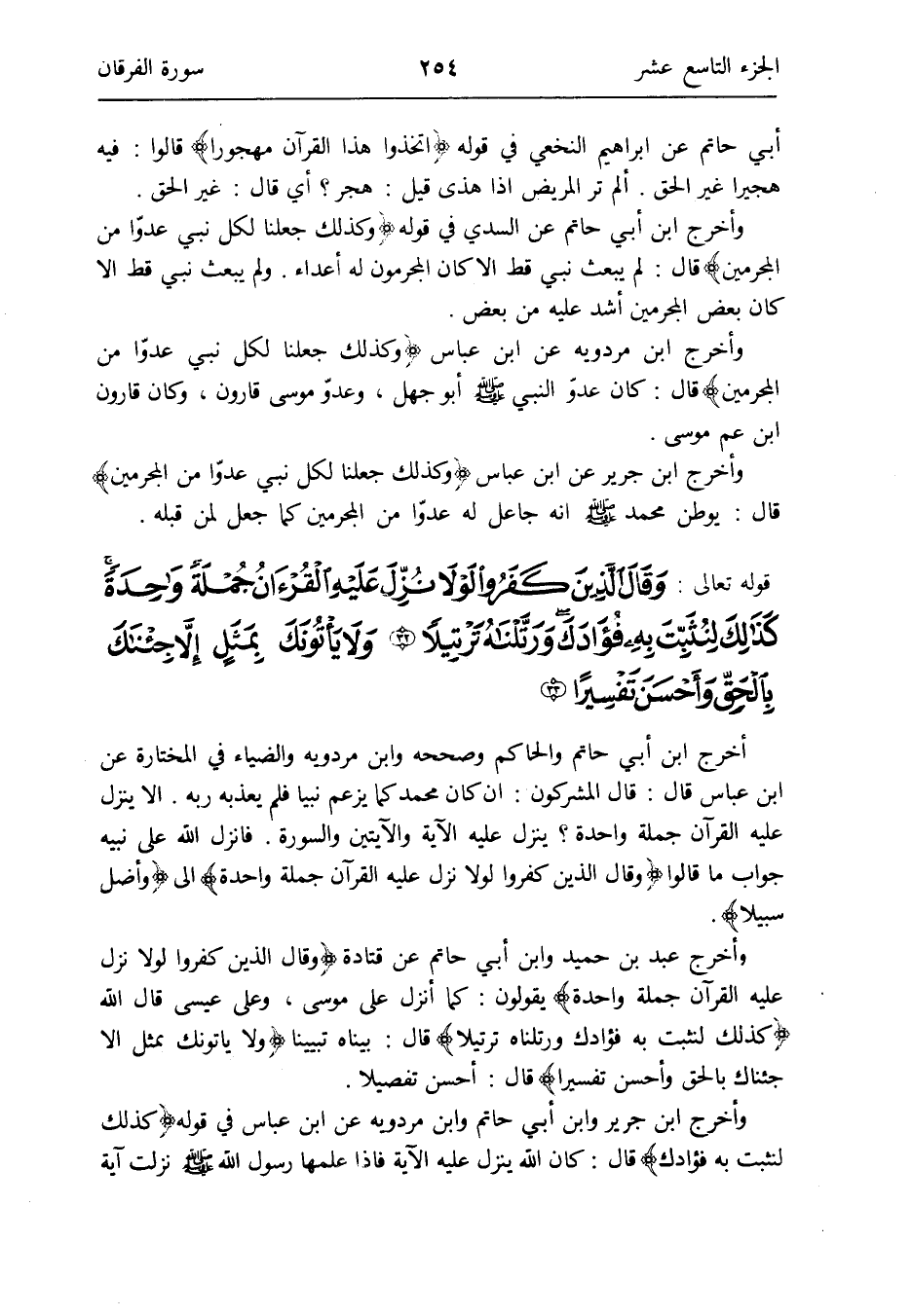 وَأخرج ابْن جرير وَابْن أبي حَاتِم وَابْن مرْدَوَيْه عَن ابْن عَبَّاس فِي قَوْله {كَذَلِك لنثبت بِهِ فُؤَادك} قَالَ: كَانَ الله ينزل عَلَيْهِ الْآيَة فَإِذا علمهَا رَسُول الله صلى الله عَلَيْهِ وَسلم نزلت آيَة