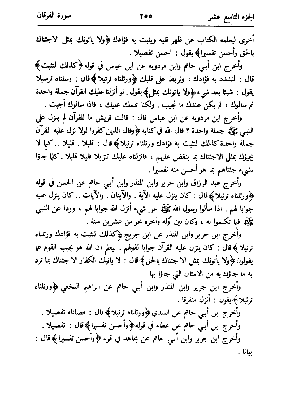 وَأخرج ابْن أبي حَاتِم وَابْن مرْدَوَيْه عَن ابْن عَبَّاس فِي قَوْله {كَذَلِك لنثبت} قَالَ: لنشدد بِهِ فُؤَادك ونربط على قَلْبك {ورتلناه ترتيلاً} قَالَ: رسلناه ترسيلاً يَقُول: شَيْئا بعد شَيْء {وَلَا يأتونك بِمثل} يَقُول: لوأنزلنا عَلَيْك الْقُرْآن جملَة وَاحِدَة ثمَّ سألوك لم يكن عنْدك مَا تجيب