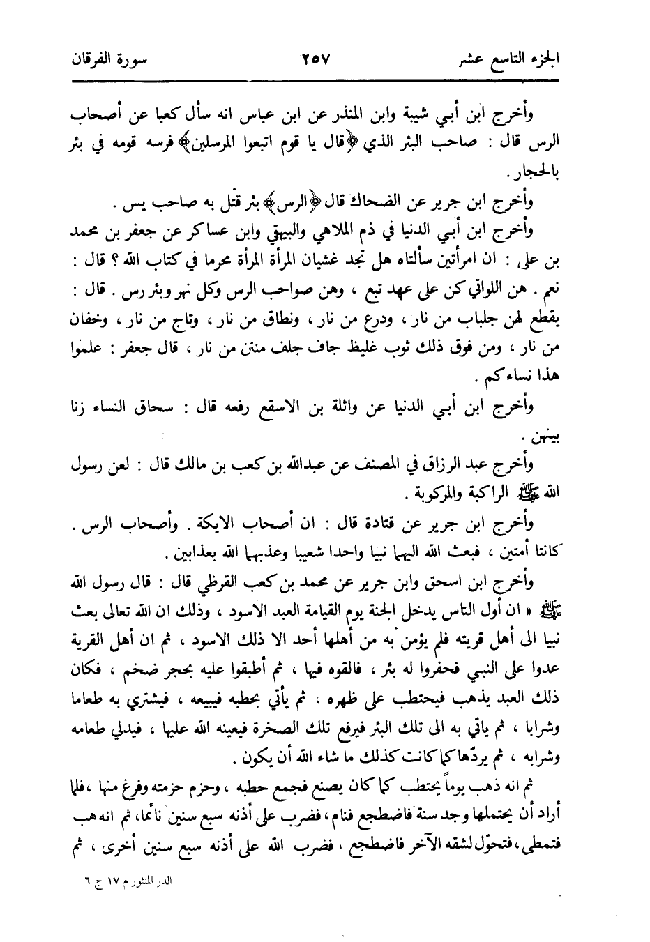 وَأخرج ابْن أبي شيبَة وَابْن الْمُنْذر عَن ابْن عَبَّاس أَنه سَأَلَ كَعْبًا عَن أَصْحَاب الرس قَالَ: صَاحب الْبِئْر الَّذِي {قَالَ يَا قوم اتبعُوا الْمُرْسلين} فرسه قومه فِي بِئْر بالحجار