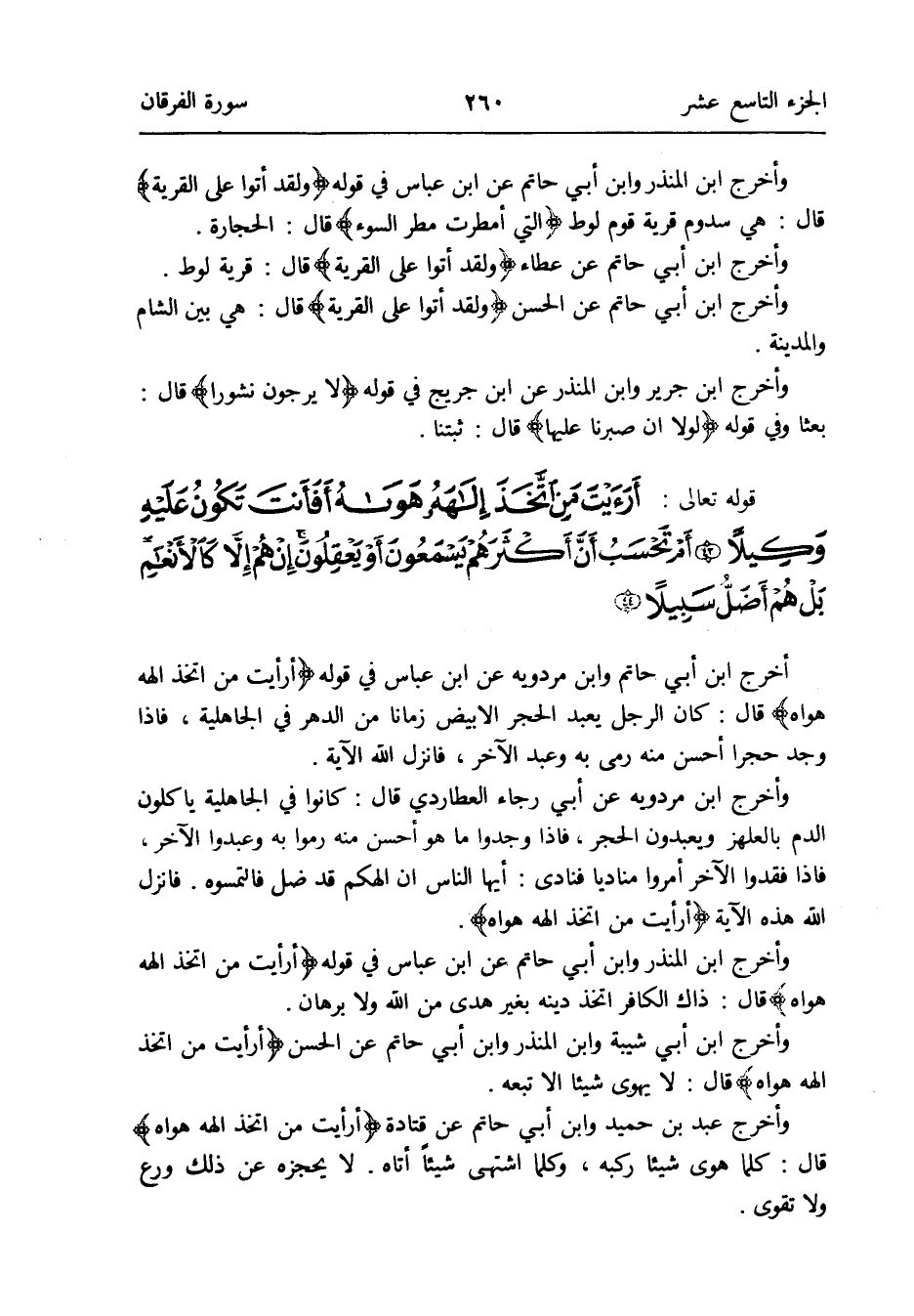 وَأخرج ابْن الْمُنْذر وَابْن أبي حَاتِم عَن ابْن عَبَّاس فِي قَوْله {أَرَأَيْت من اتخذ إلهه هَوَاهُ} قَالَ: لَا يهوى شَيْئا إِلَّا تبعه