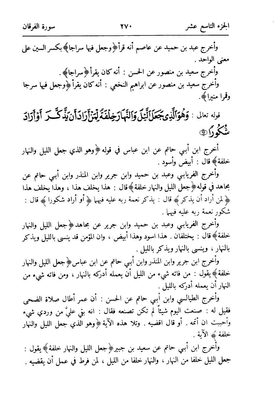 وَأخرج ابْن أبي حَاتِم عَن سعيد بن جُبَير {جعل اللَّيْل وَالنَّهَار خلفة} يَقُول: جعل اللَّيْل خلفا من النَّهَار وَالنَّهَار خلفا من اللَّيْل لمن فرط فِي عمل أَن يَقْضِيه