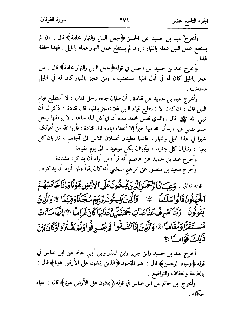 أخرج عبد بن حميد وَابْن جرير وَابْن الْمُنْذر وَابْن أبي حَاتِم عَن ابْن عَبَّاس فِي قَوْله {وَعباد الرَّحْمَن} قَالَ: هم الْمُؤْمِنُونَ {الَّذين يَمْشُونَ على الأَرْض هونا} قَالَ: بِالطَّاعَةِ والعفاف والتواضع