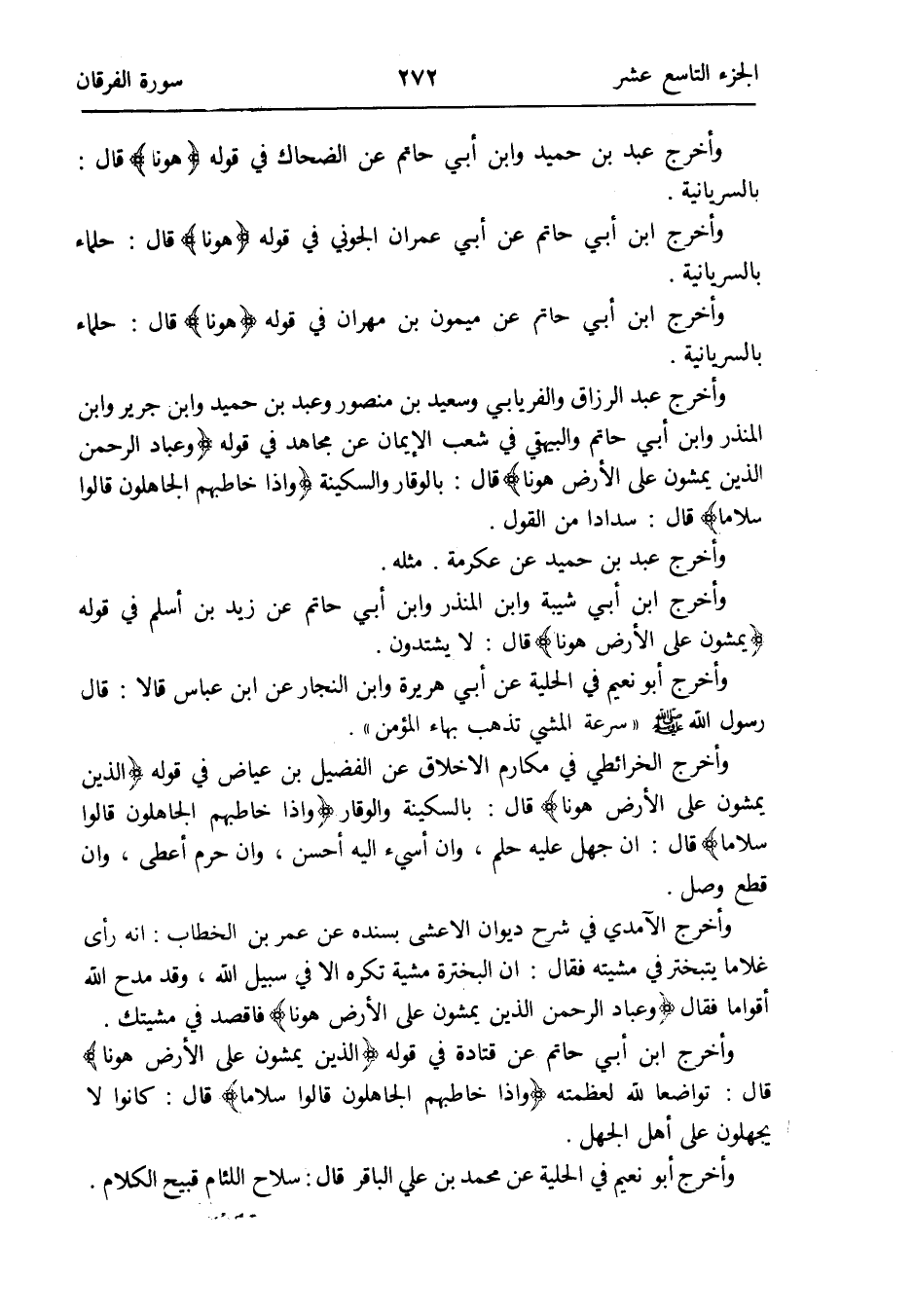 وَأخرج عبد الرَّزَّاق وَالْفِرْيَابِي وَسَعِيد بن مَنْصُور وَعبد بن حميد وَابْن جرير وَابْن الْمُنْذر وَابْن أبي حَاتِم وَالْبَيْهَقِيّ فِي شعب الإِيمان عَن مُجَاهِد فِي قَوْله {وَعباد الرَّحْمَن الَّذين يَمْشُونَ على الأَرْض هونا} قَالَ: بالوقار والسكينة {وَإِذا خاطبهم الجاهلون قَالُوا سَلاما} قَالَ: سداداً من القَوْل