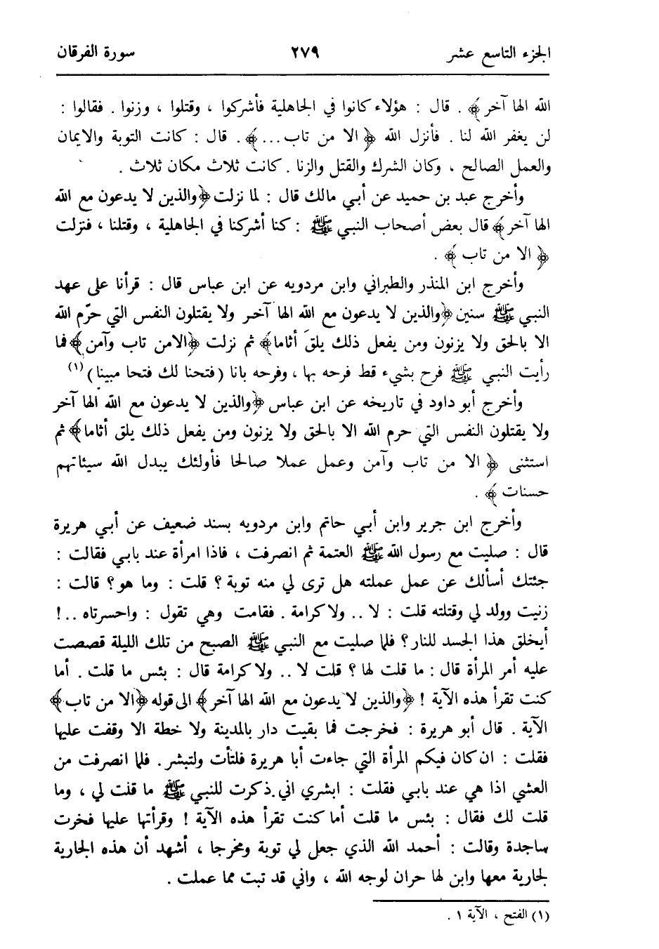 وَأخرج ابْن جرير وَابْن أبي حَاتِم وَابْن مرْدَوَيْه بِسَنَد ضَعِيف عَن أبي هُرَيْرَة قَالَ: صليت مَعَ رَسُول الله صلى الله عَلَيْهِ وَسلم الْعَتَمَة ثمَّ انصرفت فاذا امْرَأَة عِنْد بَابي فَقَالَت: جئْتُك أَسأَلك عَن عمل عملته هَل ترى لي مِنْهُ تَوْبَة قلت: وَمَا هُوَ قَالَت: زَنَيْت وَولد لي وقتلته قلت: لَا