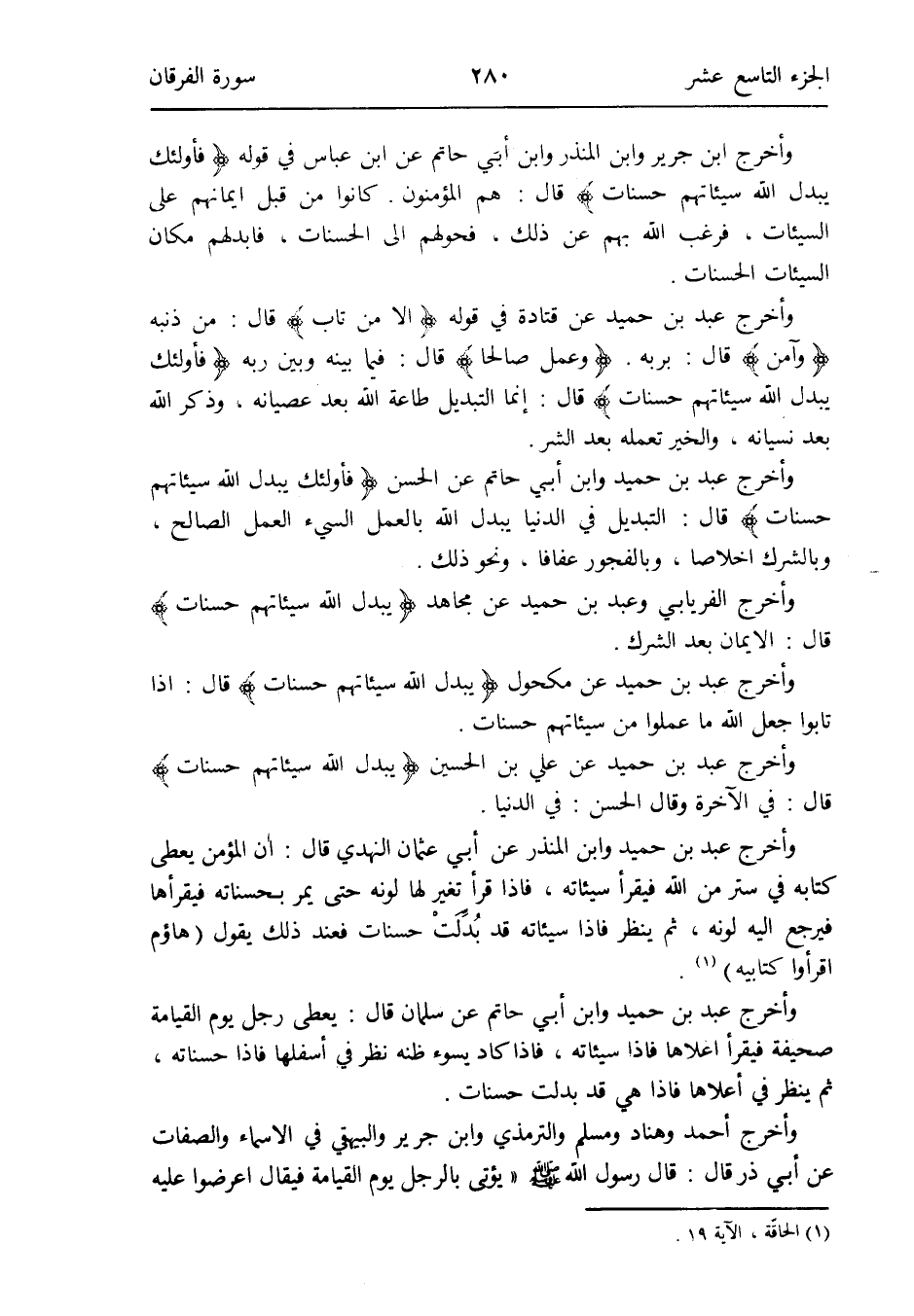 وَأخرج أَحْمد وهناد وَمُسلم وَالتِّرْمِذِيّ وَابْن جرير وَالْبَيْهَقِيّ فِي الْأَسْمَاء وَالصِّفَات عَن أبي ذَر قَالَ: قَالَ رَسُول الله صلى الله عَلَيْهِ وَسلم يُؤْتى بِالرجلِ يَوْم الْقِيَامَة فَيُقَال اعرضوا عَلَيْهِ