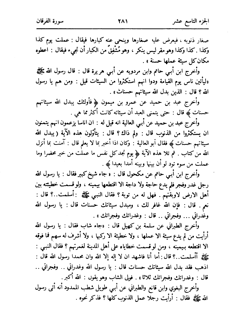 وَأخرج ابْن أبي حَاتِم وَابْن مرْدَوَيْه عَن أبي هُرَيْرَة قَالَ: قَالَ رَسُول الله صلى الله عَلَيْهِ وَسلم ليَأْتِيَن نَاس يَوْم الْقِيَامَة ودوا انهم استكثروا من السَّيِّئَات قبل: وَمن هم يَا رَسُول الله قَالَ: الَّذين بدل الله سيئاتهم حَسَنَات