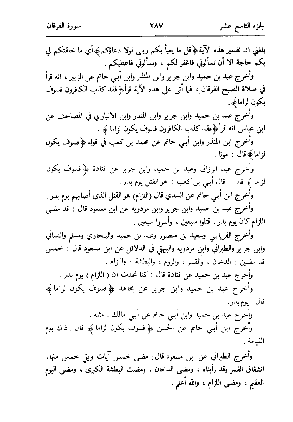 وَأخرج عبد بن حميد وَابْن جرير وَابْن الْمُنْذر وَابْن أبي حَاتِم عَن الزبير انه قَرَأَ فِي صَلَاة الصُّبْح الْفرْقَان فَلَمَّا أَتَى على هَذِه الْآيَة قَرَأَ (فقد كذب الْكَافِرُونَ فَسَوف يكون لزاماً)