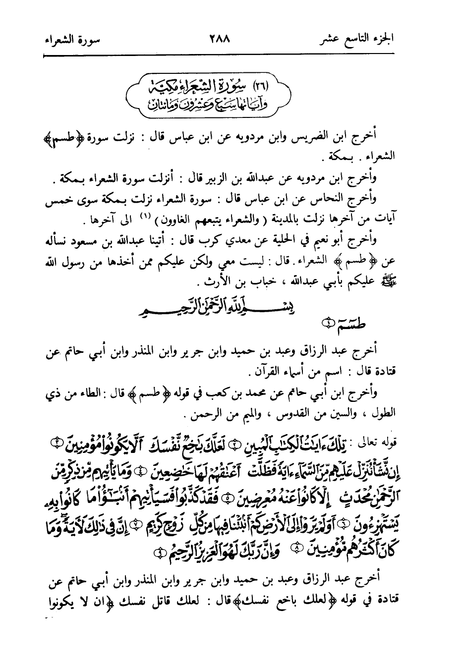 - مُقَدّمَة سُورَة الشُّعَرَاء أخرج ابْن ضريس وَابْن مرْدَوَيْه عَن ابْن عَبَّاس قَالَ: نزلت سُورَة {طسم} الشُّعَرَاء