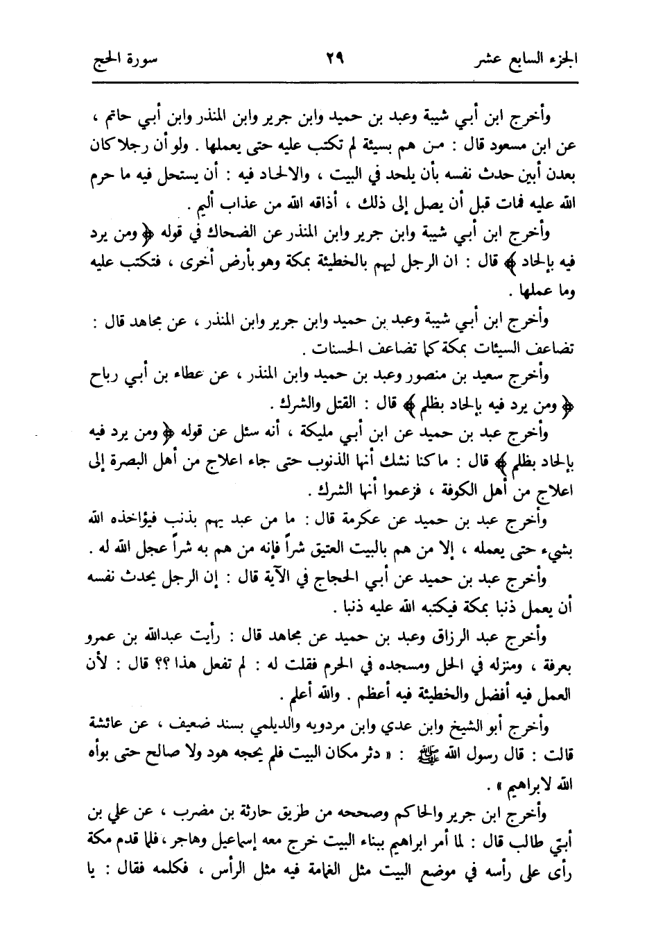 وَأخرج عبد بن حميد عَن ابْن أبي مليكَة أَنه سُئِلَ عَن قَوْله {وَمن يرد فِيهِ بإلحاد بظُلْم} قَالَ: مَا كُنَّا نشك أَنَّهَا الذُّنُوب حَتَّى جَاءَ إعلاج من أهل الْبَصْرَة إِلَى إعلاج من أهل الْكُوفَة فزعموا أَنَّهَا الشّرك