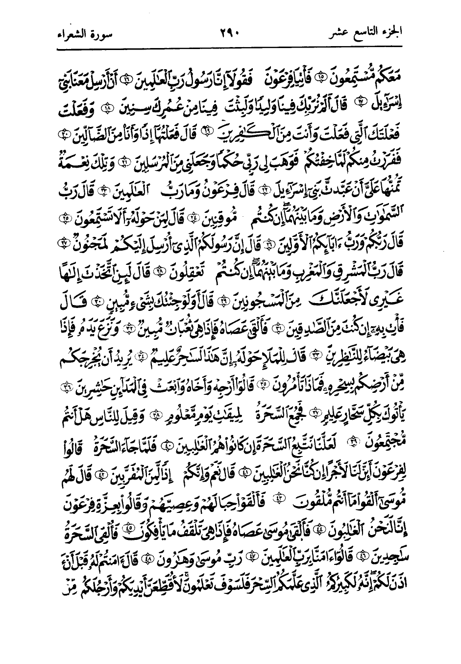 مَعكُمْ مستمعون فَأتيَا فِرْعَوْن فقولا إِنَّا رَسُول رب الْعَالمين أَن أرسل مَعنا بني إِسْرَائِيل قَالَ ألم نربك فِينَا وليداً وَلَبِثت فِينَا من عمرك سِنِين وَفعلت فعلتك الَّتِي فعلت وَأَنت من الْكَافرين قَالَ فعلتها إِذا وَأَنا من الضَّالّين ففررت مِنْكُم لما خفتكم فوهب لي رَبِّي حكما وَجَعَلَنِي من الْمُرْسلين وَتلك نعْمَة تمنها عليَّ أَن عبدت بني إِسْرَائِيل قَالَ فِرْعَوْن وَمَا رب الْعَالمين قَالَ رب السَّمَوَات وَالْأَرْض وَمَا بَينهمَا إِن كُنْتُم موقنين قَالَ لمن حوله أَلا تستمعون قَالَ ربكُم وَرب آبائكم الْأَوَّلين قَالَ إِن رَسُولكُم الَّذِي أرسل إِلَيْكُم لمَجْنُون قَالَ رب الْمشرق وَالْمغْرب وَمَا بَينهمَا إِن كُنْتُم تعقلون قَالَ لَئِن اتَّخذت إِلَهًا غَيْرِي لأجعلنك من المسجونين قَالَ أولو جئْتُك بِشَيْء مُبين قَالَ فأت بِهِ إِن كنت من الصَّادِقين فَألْقى عَصَاهُ فَإِذا هِيَ ثعبان مُبين وَنزع يَده فَإِذا هِيَ بَيْضَاء للناظرين قَالَ للملأ حوله إِن هَذَا لساحر عليم يُرِيد أَن يخرجكم من أَرْضكُم بسحره فَمَاذَا تأمرون قَالُوا أرجه وأخاه وَابعث فِي الْمَدَائِن حاشرين يأتوك بِكُل سحار عليم فَجمع السَّحَرَة لميقات يَوْم مَعْلُوم وَقيل للنَّاس هَل أَنْتُم مجتمعون لَعَلَّنَا نتبع السَّحَرَة إِن كَانُوا هم الغالبين فَلَمَّا جَاءَ السَّحَرَة قَالُوا لفرعون أئنا لنا لأجراً إِن كُنَّا نَحن الغالبين قَالَ نعم وَإِنَّكُمْ إِذا لمن المقربين قَالَ لَهُم مُوسَى ألقوا مَا أَنْتُم ملقون فَألْقوا حبالهم وعصيهم وَقَالُوا بعزة فِرْعَوْن إِنَّا لنَحْنُ الغالبون فَألْقى مُوسَى عَصَاهُ فَإِذا هِيَ تلقف مَا يأفكون فألقي السَّحَرَة ساجدين قَالُوا آمنا بِرَبّ الْعَالمين رب مُوسَى وَهَارُون قَالَ أآمنتم لَهُ قبل أَن آذن لكم إِنَّه لكبيركم الَّذِي علمكُم السحرفلسوف تعلمُونَ لأقطعن أَيْدِيكُم وأرجلكم من