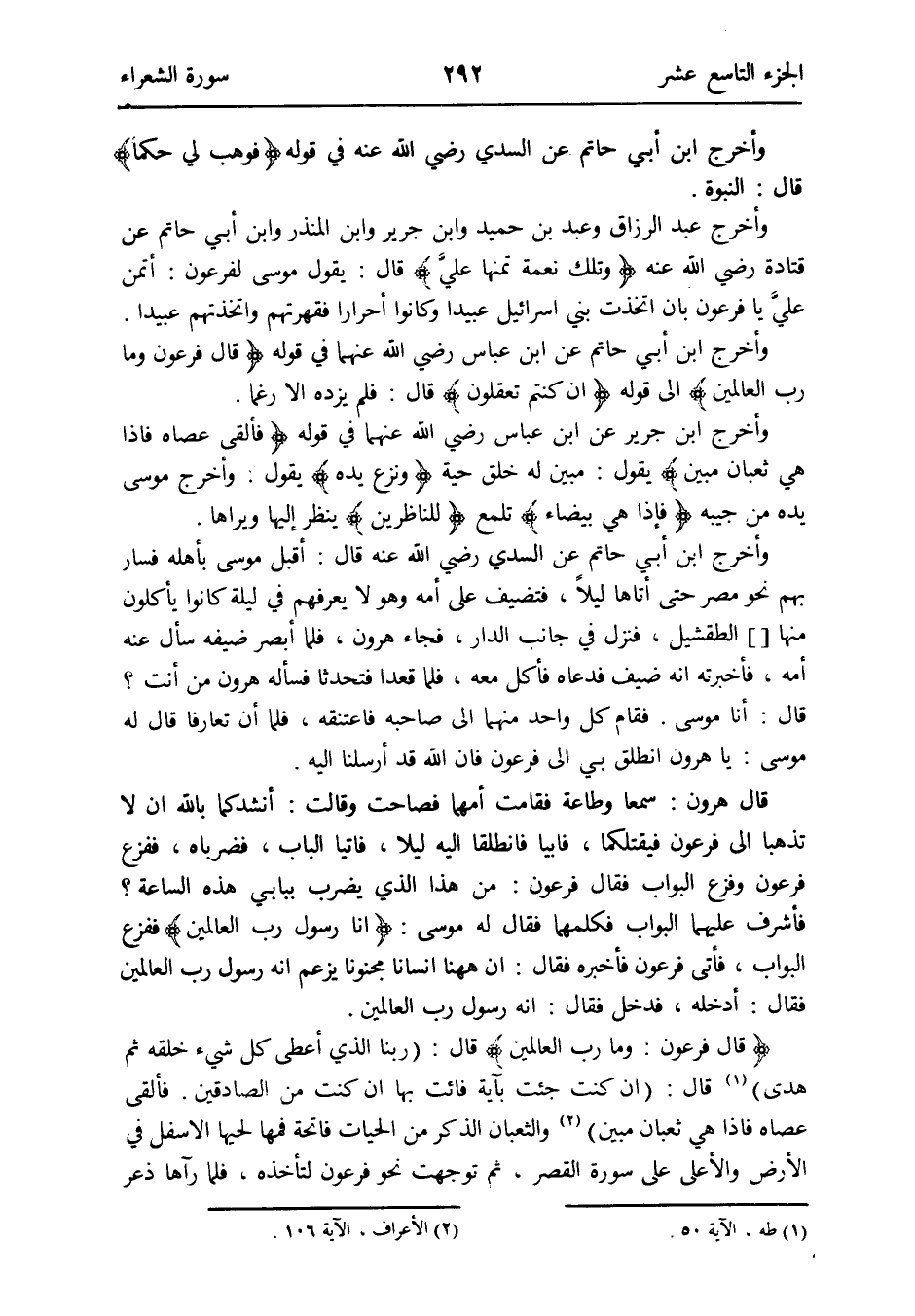 {قَالَ فِرْعَوْن وَمَا رب الْعَالمين} قَالَ: {رَبنَا الَّذِي أعْطى كل شَيْء خلقه ثمَّ هدى} طه الْآيَة 50 قَالَ: {إِن كنت جِئْت بِآيَة فأت بهَا إِن كنت من الصَّادِقين فَألْقى عَصَاهُ فَإِذا هِيَ ثعبان مُبين} الْأَعْرَاف الْآيَة 106 والثعبان الذّكر من الْحَيَّات فَاتِحَة فمها لحيها الْأَسْفَل فِي الأَرْض والأعلى على سُورَة الْقصر ثمَّ تَوَجَّهت نَحْو فِرْعَوْن لتأخذه فَلَمَّا رَآهَا ذعر