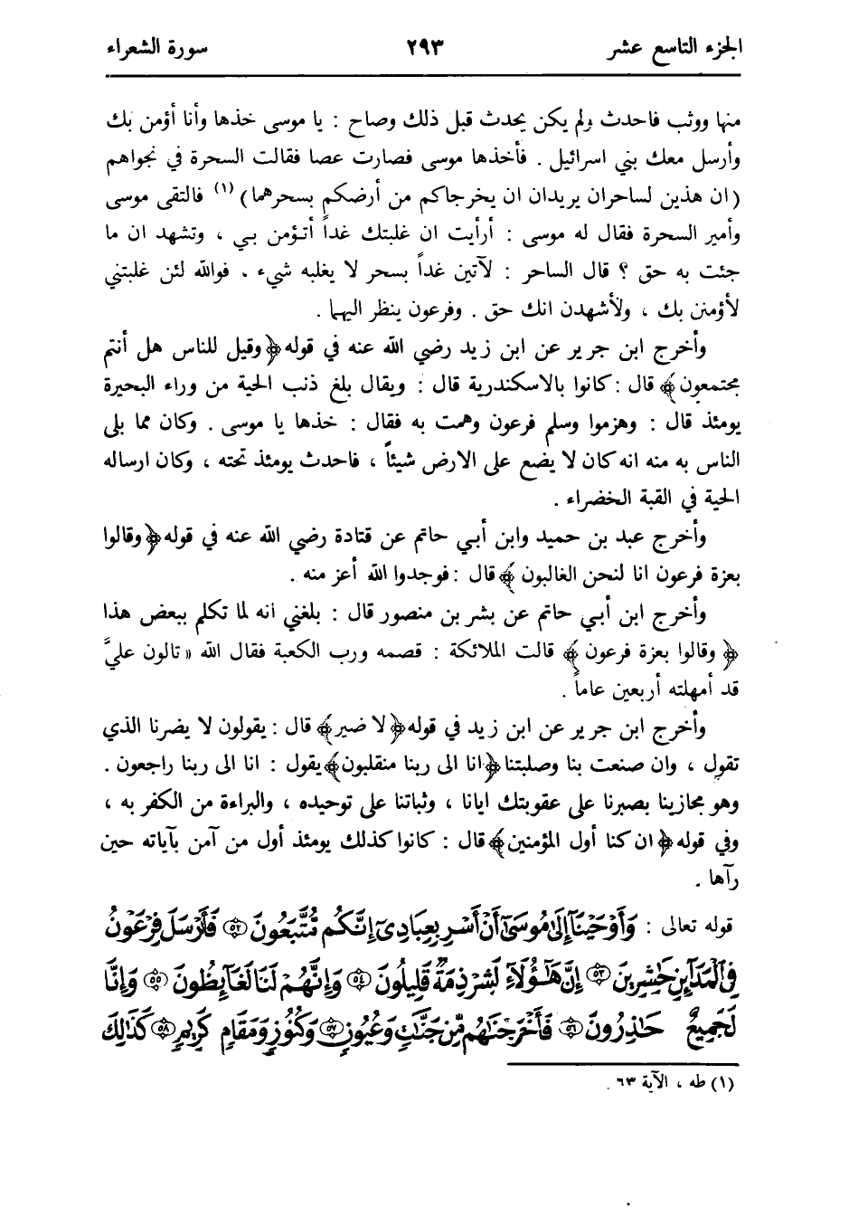 وَأخرج ابْن جرير عَن ابْن زيد رَضِي الله عَنهُ فِي قَوْله {وَقيل للنَّاس هَل أَنْتُم مجتمعون} قَالَ: كَانُوا بالاسكندرية قَالَ: وَيُقَال بلغ ذَنْب الْحَيَّة من وَرَاء الْبحيرَة يَوْمئِذٍ قَالَ: وهزموا وَسلم فِرْعَوْن وهمت بِهِ فَقَالَ: خُذْهَا يَا مُوسَى