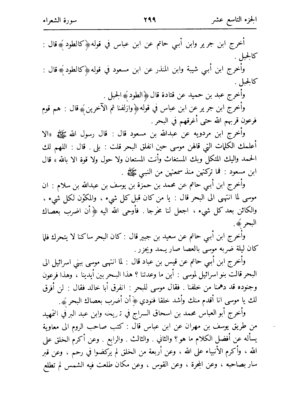 وَأخرج ابْن مرْدَوَيْه عَن عبد الله بن مَسْعُود قَالَ: قَالَ رَسُول الله صلى الله عَلَيْهِ وَسلم أَلا أعلمك الْكَلِمَات الَّتِي قالهن مُوسَى حِين انْفَلق الْبَحْر قلت: بلَى