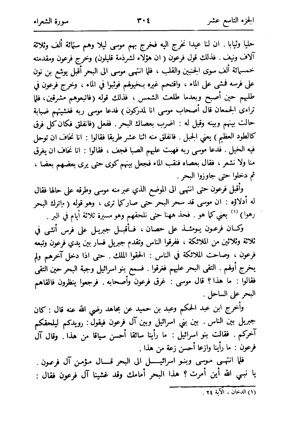 فَذَلِك قَول فِرْعَوْن {إِن هَؤُلَاءِ لشرذمة قَلِيلُونَ} وَخرج فِرْعَوْن ومقدمته خَمْسمِائَة ألف سوى الجنبين وَالْقلب فَلَمَّا انْتهى مُوسَى إِلَى الْبَحْر أقبل يُوشَع بن نون على فرسه فَمشى على المَاء واقتحم غَيره بخيولهم فَوَثَبُوا فِي المَاء وَخرج فِرْعَوْن فِي طَلَبهمْ حِين أصبح وَبَعْدَمَا طلعت الشَّمْس فَذَلِك قولهل {فأتبعوهم مشرقين فَلَمَّا ترَاءى الْجَمْعَانِ قَالَ أَصْحَاب مُوسَى إِنَّا لمدركون} فَدَعَا مُوسَى ربه فغشيتهم ضَبَابَة حَالَتْ بَينهم وَبَينه وَقيل لَهُ: اضْرِب بعصاك الْبَحْر