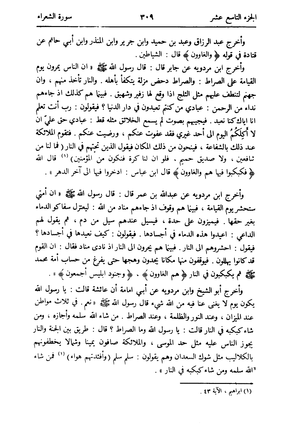 وَأخرج ابْن مرْدَوَيْه عَن عبد الله بن عمر قَالَ: قَالَ رَسُول الله صلى الله عَلَيْهِ وَسلم إِن أمتِي ستحشر يَوْم الْقِيَامَة فَبَيْنَمَا هم وقُوف إِذْ جَاءَهُم مُنَاد من الله: ليعتزل سفاكو الدِّمَاء بِغَيْر حَقّهَا