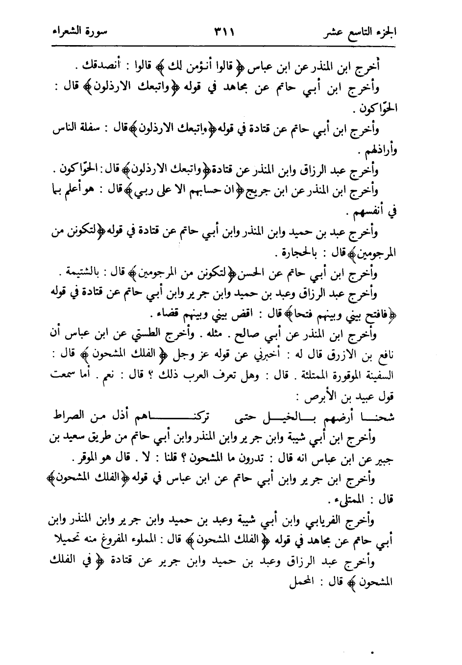 وَأخرج الطستي عَن ابْن عَبَّاس إِن نَافِع بن الْأَزْرَق قَالَ لَهُ: أَخْبرنِي عَن قَوْله عزَّ وَجل {الْفلك المشحون} قَالَ: السَّفِينَة الموقورة الممتلئة