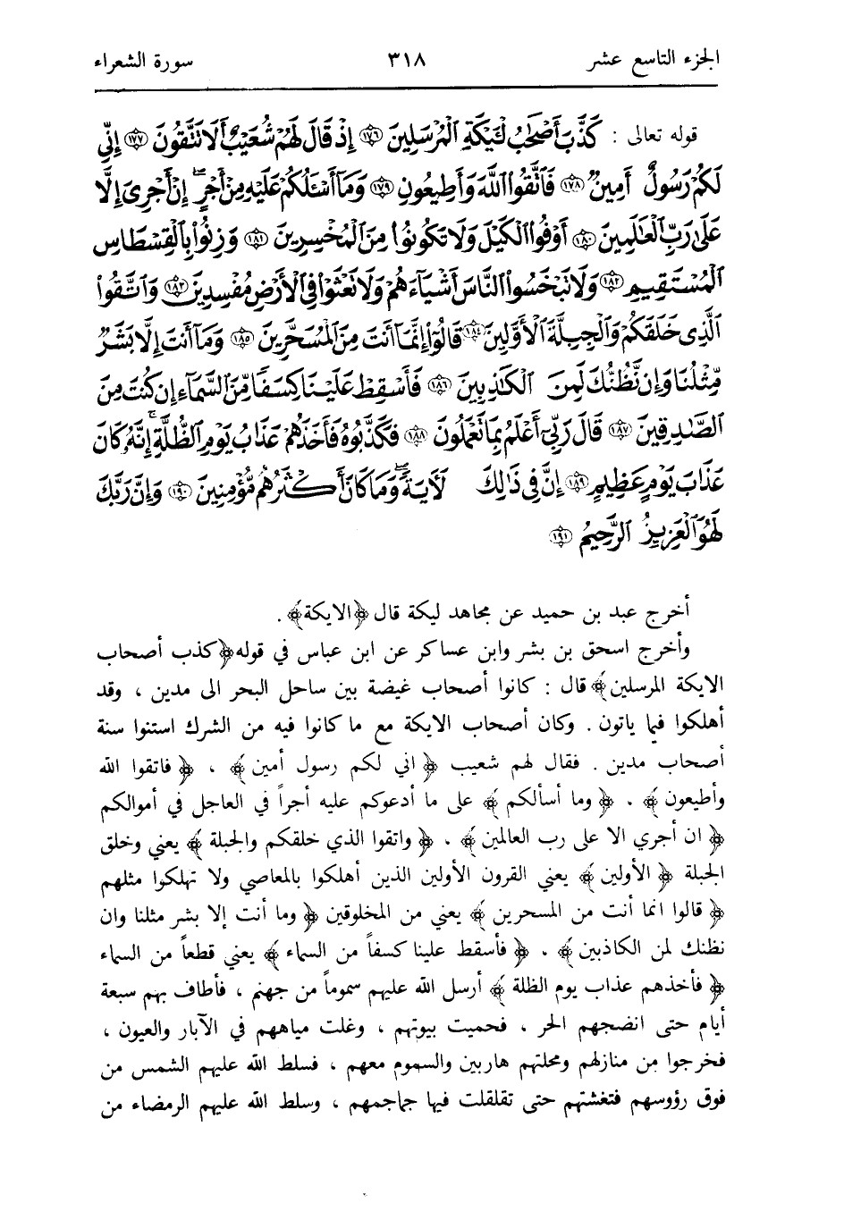 - قَوْله تَعَالَى: كذب أَصْحَاب الأيكة الْمُرْسلين إِذْ قَالَ لَهُم شُعَيْب أَلا تَتَّقُون إِنِّي لكم رَسُول أَمِين فَاتَّقُوا الله وأطيعون وَمَا أَسأَلكُم عَلَيْهِ من أجر إِن أجري إِلَّا على رب الْعَالمين وأوفوا الْكَيْل وَلَا تَكُونُوا من المخسرين وزنوا بالقسطاس الْمُسْتَقيم وَلَا تبخسوا النَّاس أشياءهم وَلَا تعثوا فِي الأَرْض مفسدين وَاتَّقوا الَّذِي خَلقكُم والجبلة الْأَوَّلين قَالُوا إِنَّمَا أنتمن المسحرين وَمَا أَنْت إِلَّا بشر مثلنَا وَإِن نظنك لمن الْكَاذِبين فأسقط علينا كسفا من السَّمَاء إِن كنت من الصَّادِقين قَالَ رَبِّي أعلم بِمَا تَعْمَلُونَ فَكَذبُوهُ فَأَخذهُم عَذَاب يَوْم الظلة أَنه كَانَ عَذَاب يَوْم عَظِيم إِن فِي ذَلِك لآيَة وَمَا كَانَ أَكْثَرهم مُؤمنين وَإِن رَبك لَهو الْعَزِيز الرَّحِيم