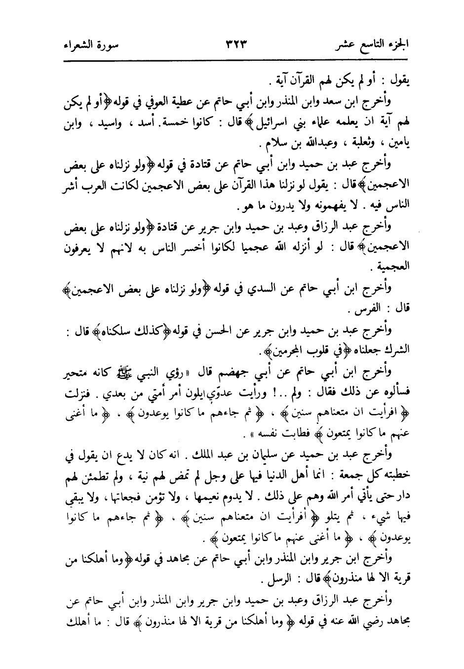 وَأخرج عبد الرَّزَّاق وَعبد بن حميد وَابْن جرير عَن قَتَادَة {وَلَو نزلناه على بعض الأعجمين} قَالَ: لَو أنزلهُ الله عجمياً لكانوا أخسر النَّاس بِهِ لأَنهم لَا يعْرفُونَ العجمية
