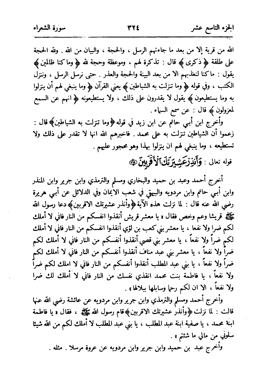 أخرج أَحْمد وَعبد بن حميد وَالْبُخَارِيّ وَمُسلم وَابْن جرير وَابْن الْمُنْذر وَابْن أبي حَاتِم وَابْن مرْدَوَيْه وَالْبَيْهَقِيّ فِي شعب الْإِيمَان وَفِي الدَّلَائِل عَن أبي هُرَيْرَة رَضِي الله عَنهُ قَالَ: لما نزلت هَذِه الْآيَة {وأنذر عشيرتك الْأَقْرَبين} دَعَا رَسُول الله صلى الله عَلَيْهِ وَسلم قُريْشًا وَعم وَخص فَقَالَ يَا معشر قُرَيْش أَنْقِذُوا أَنفسكُم من النَّار فَإِنِّي لَا أملك لكم ضراً وَلَا نفعا يَا معشر بني كَعْب بني لؤَي أَنْقِذُوا أَنفسكُم من النَّار فَإِنِّي لَا أملك لكم ضراً وَلَا نفعا يَا معشر بني قصي أَنْقِذُوا أَنفسكُم من النَّار فَإِنِّي لَا أملك لكم ضراً وَلَا نفعا يَا معشر بني عبد منَاف أَنْقِذُوا أَنفسكُم من النَّار فَإِنِّي لَا أملك لكم ضراً وَلَا نفعا يَا بني عبد الْمطلب أَنْقِذُوا أَنفسكُم من النَّار فَإِنِّي لَا أملك لكم ضراً وَلَا نفعا يَا فَاطِمَة بنت مُحَمَّد انقذي نَفسك من النَّار فَإِنِّي لَا أملك لَك ضراً وَلَا نفعا أَلا إِن لكم رحما وسابلها بِبلَالِهَا