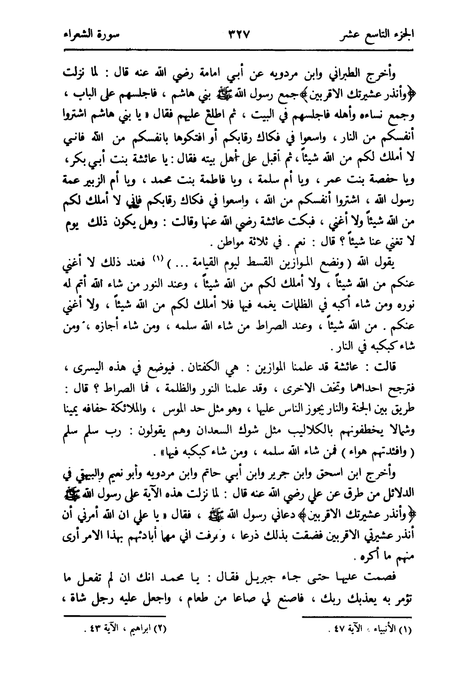 وَأخرج الطَّبَرَانِيّ وَابْن مرْدَوَيْه عَن أبي امامة رَضِي الله عَنهُ قَالَ: لما نزلت {وأنذر عشيرتك الْأَقْرَبين} جمع رَسُول الله صلى الله عَلَيْهِ وَسلم بني هَاشم فاجلسهم على الْبَاب وَجمع نِسَاءَهُ وَأَهله فأجلسهم فِي الْبَيْت ثمَّ اطلع عَلَيْهِم فَقَالَ يَا بني هَاشم اشْتَروا أَنفسكُم من النَّار واسعوا فِي فكاك رِقَابكُمْ أَو افتكوها بِأَنْفُسِكُمْ من الله فَإِنِّي لَا أملك لكم من الله شَيْئا ثمَّ أقبل على أهل بَيته فَقَالَ: يَا عَائِشَة بنت أبي بكر وَيَا حَفْصَة بنت عمر وَيَا أم سَلمَة وَيَا فَاطِمَة بنت مُحَمَّد وَيَا أم الزبير عمَّة رَسُول الله اشْتَروا أَنفسكُم من الله واسعوا فِي فكاك رِقَابكُمْ فَإِنِّي لَا أملك لكم من الله شَيْئا وَلَا أُغني فَبَكَتْ عَائِشَة رَضِي الله عَنْهَا وَقَالَت: وَهل يكون ذَلِك يَوْم لَا تغني عَنَّا شئياً قَالَ: نعم