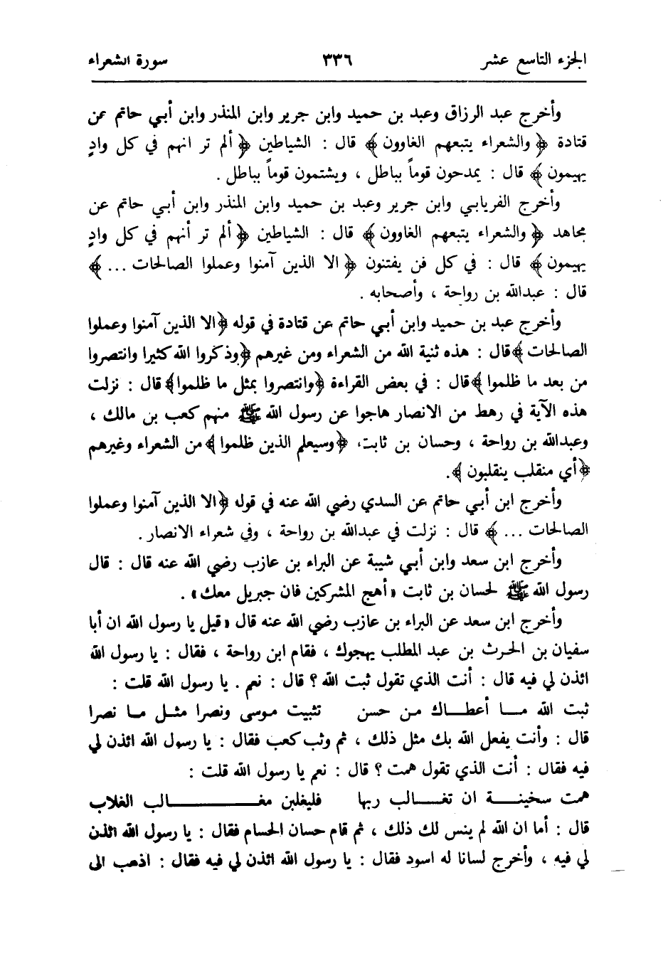 وَأخرج عبد بن حميد وَابْن أبي حَاتِم عَن قَتَادَة {إِلَّا الَّذين آمنُوا وَعمِلُوا الصَّالِحَات} قَالَ: هَذِه ثنية الله من الشُّعَرَاء وَمن غَيرهم {وَذكروا الله كثيرا وانتصروا من بعد مَا ظلمُوا} قَالَ: فِي بعض الْقِرَاءَة {وانتصروا من بعد مَا ظلمُوا} قَالَ: نزلت هَذِه الْآيَة فِي رَهْط من الْأَنْصَار هاجوا عَن رَسُول الله صلى الله عَلَيْهِ وَسلم مِنْهُم كَعْب بن مَالك وَعبد الله بن رَوَاحَة وَحسان بن ثَابت {وَسَيعْلَمُ الَّذين ظلمُوا} من الشُّعَرَاء وَغَيرهم {أَي مُنْقَلب يَنْقَلِبُون}