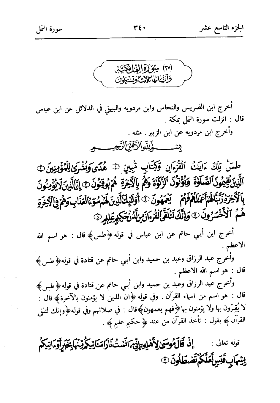 - مُقَدّمَة سُورَة النَّمْل أخرج ابْن الضريس والنحاس وَابْن مرْدَوَيْه وَالْبَيْهَقِيّ فِي الدَّلَائِل عَن ابْن عَبَّاس قَالَ: أنزلت سُورَة النَّمْل بِمَكَّة
