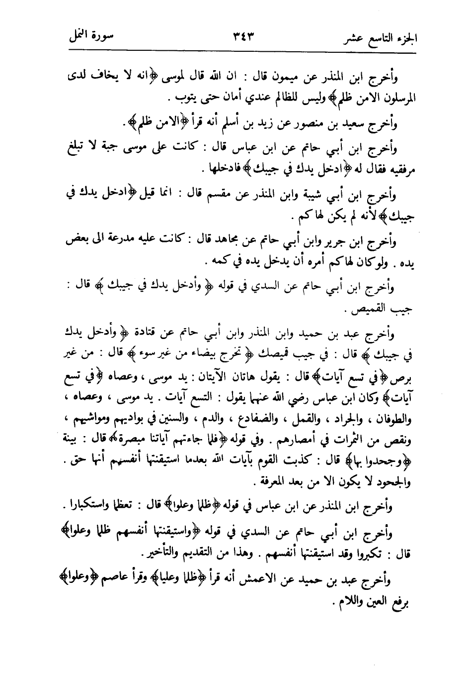 وَأخرج عبد بن حميد وَابْن الْمُنْذر وَابْن أبي حَاتِم عَن قَتَادَة {وَأدْخل يدك فِي جيبك} قَالَ: فِي جيب قَمِيصك {تخرج بَيْضَاء من غير سوء} قَالَ: من غير برص {فِي تسع آيَات} قَالَ: يَقُول هَاتَانِ الْآيَتَانِ: يَد مُوسَى وَعَصَاهُ والطوفان وَالْجَرَاد وَالْقمل والضفادع وَالدَّم والسنين فِي بواديهم ومواشيهم وَنقص من الثمرات فِي أمصارهم