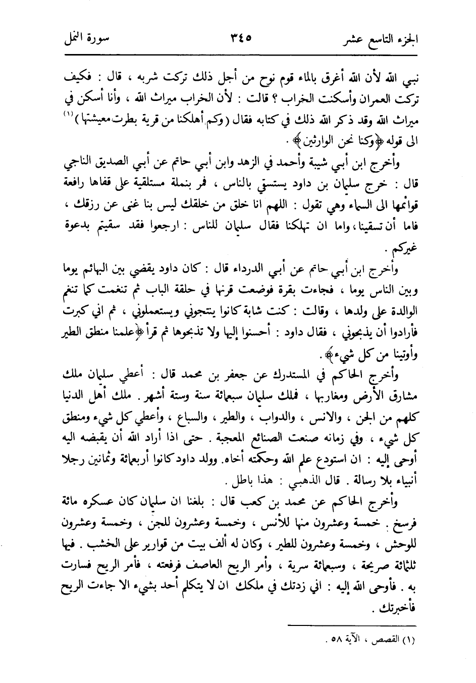 وَأخرج ابْن أبي حَاتِم عَن أبي الدَّرْدَاء قَالَ: كَانَ دَاوُد يقْضِي بَين الْبَهَائِم يَوْمًا وَبَين النَّاس يَوْمًا فَجَاءَت بقرة فَوضعت قرنها فِي حَلقَة الْبَاب ثمَّ تنغمت كَمَا تنغم الوالدة على وَلَدهَا وَقَالَت: كنت شَابة كَانُوا ينتجوني ويستعملوني ثمَّ إِنِّي كَبرت فأرادوا أَن يذبحوني فَقَالَ دَاوُد: أَحْسنُوا إِلَيْهَا وَلَا تذبحوها ثمَّ قَرَأَ {علمنَا منطق الطير وأوتينا من كل شَيْء}