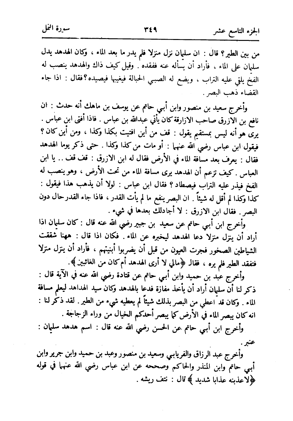حَتَّى ذكر يَوْمًا الهدهد فَقَالَ: يعرف بعد مَسَافَة المَاء فِي الأَرْض فَقَالَ لَهُ ابْن الْأَزْرَق: قف قف