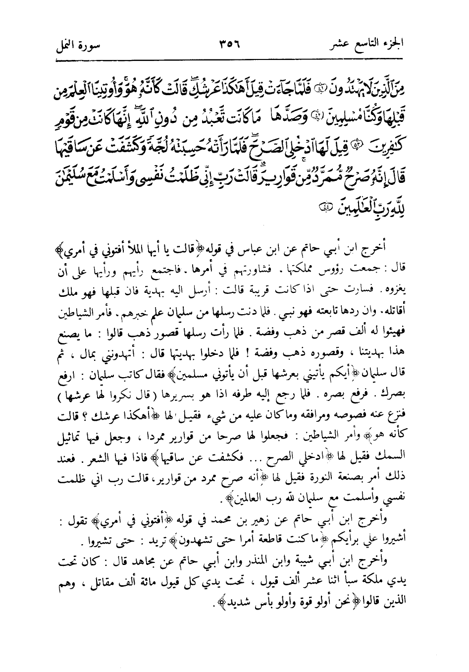 من الَّذين لَا يَهْتَدُونَ فَلَمَّا جَاءَت قيل أهكذا عرشك قَالَت كَأَنَّهُ هُوَ وأوتينا الْعلم من قبلهَا وَكُنَّا مُسلمين وصدها مَا كَانَت تعبد من دون الله إِنَّهَا كَانَت من قوم كَافِرين قيل لَهَا ادخلي الصرح فَلَمَّا رَأَتْهُ حسبته لجة وكشفت عَن سَاقيهَا قَالَ إِنَّه صرح ممرد من قَوَارِير قَالَت رب إِنِّي ظلمت نَفسِي وَأسْلمت مَعَ سُلَيْمَان لله رب الْعَالمين