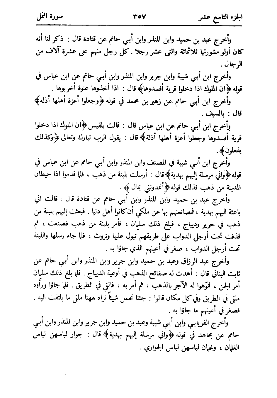 وَأخرج ابْن أبي حَاتِم عَن ابْن عَبَّاس قَالَ: قَالَت بلقيس {إِن الْمُلُوك إِذا دخلُوا قَرْيَة أفسدوها وَجعلُوا أعزة أَهلهَا أَذِلَّة} قَالَ: يَقُول الرب تبَارك وَتَعَالَى {وَكَذَلِكَ يَفْعَلُونَ}