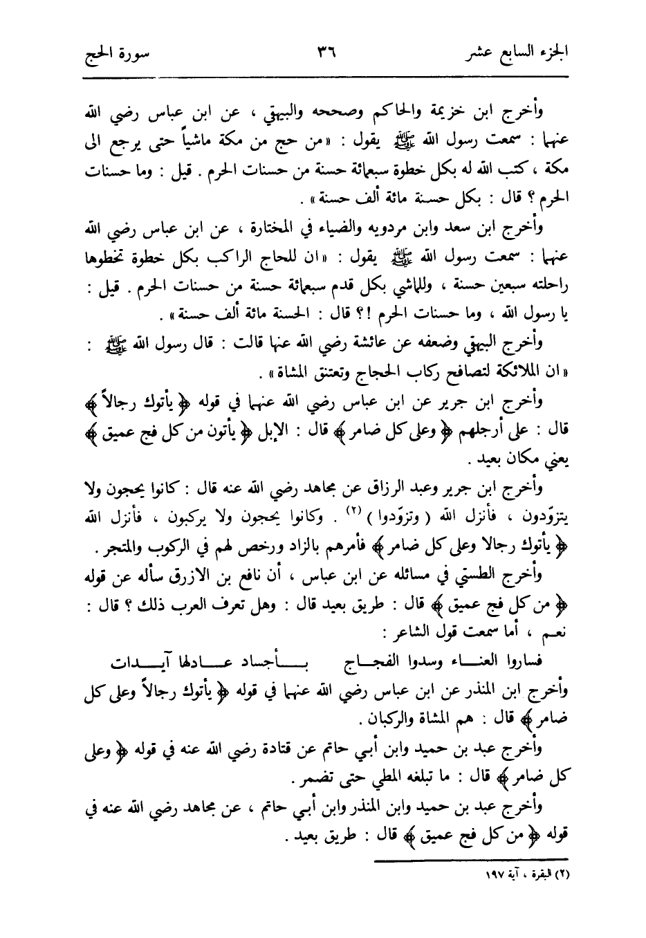 وَأخرج ابْن جرير عَن ابْن عَبَّاس رَضِي الله عَنْهُمَا فِي قَوْله {يأتوك رجَالًا} قَالَ: على أَرجُلهم {وعَلى كل ضامر} قَالَ: الْإِبِل {يَأْتِين من كل فج عميق} يَعْنِي مَكَان بعيد