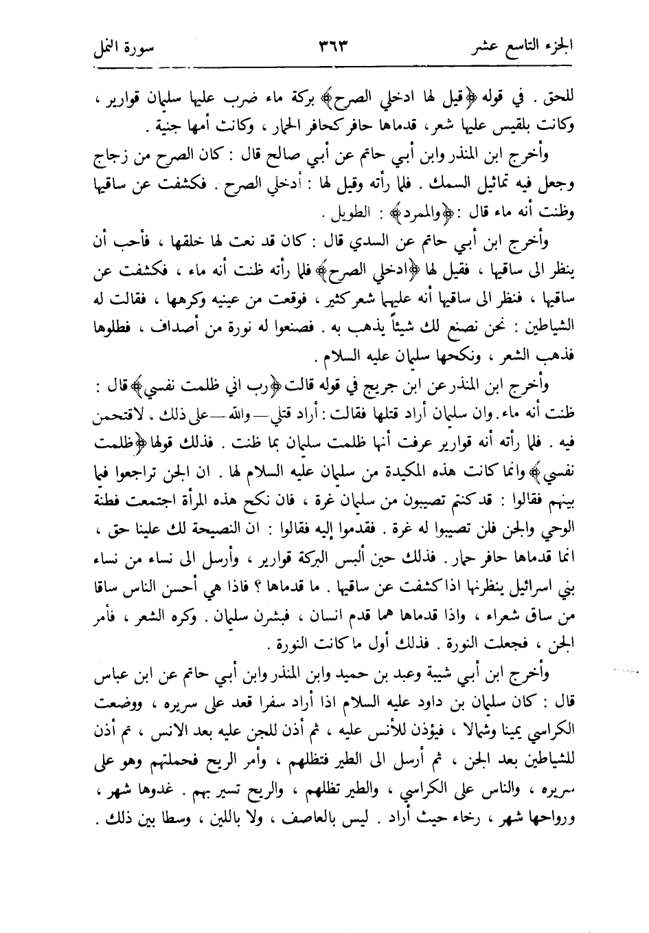 وَأخرج ابْن أبي حَاتِم عَن السّديّ قَالَ: كَانَ قد نعت لَهَا خلقهَا فَأحب أَن ينظر إِلَى سَاقيهَا فَقيل لَهَا {ادخلي الصرح} فَلَمَّا رَأَتْهُ ظنت أَنه مَاء فَكشفت عَن سَاقيهَا فَنظر إِلَى سَاقيهَا أَنه عَلَيْهِمَا شعر كثير فَوَقَعت من عَيْنَيْهِ وكرهها فَقَالَت لَهُ الشَّيَاطِين: نَحن نصْنَع لَك شَيْئا يذهب بِهِ
