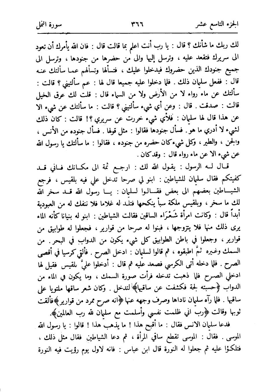 قَالَ لَهُ الرَّسُول: يَقُول الله لَك: ارْجع ثمَّة إِلَى مَكَانك فَإِنِّي قد كفيتكم فَقَالَ سُلَيْمَان للشياطين: ابنو لي صرحاً تدخل عَليّ فِيهِ بلقيس فَرجع الشَّيَاطِين بَعضهم إِلَى بعض فَقَالُوا لِسُلَيْمَان: يَا رَسُول الله قد سخر الله لَك مَا سخر وبلقيس ملكة سبأ ينْكِحهَا فتلد لَهُ غُلَاما فَلَا ننفك لَهُ من الْعُبُودِيَّة أبدا قَالَ: وَكَانَت امْرَأَة شَعْرَاء السَّاقَيْن فَقَالَت الشَّيَاطِين: ابنو لَهُ بنياناً كَأَنَّهُ المَاء يرى ذَلِك مِنْهَا فَلَا يَتَزَوَّجهَا فبنوا لَهُ صرحاً من قَوَارِير فَجعلُوا لَهُ طوابيق من قَوَارِير وَجعلُوا من بَاطِن الطوابيق كل شَيْء يكون من الدَّوَابّ فِي الْبَحْر
