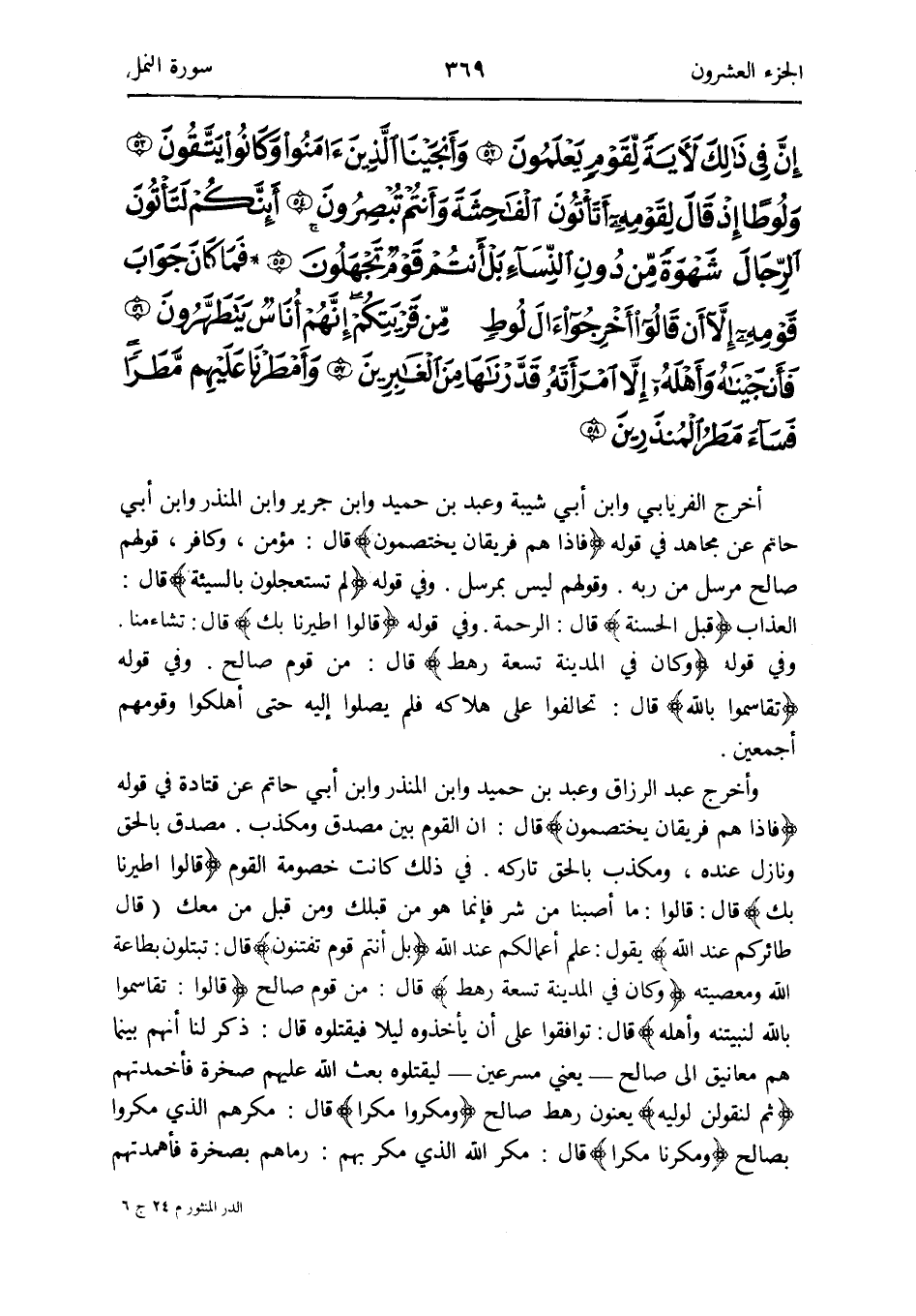 فِي ذَلِك كَانَت خُصُومَة الْقَوْم {قَالُوا اطيرنا بك} قَالَ: قَالُوا: مَا أصبْنَا من شَرّ فَإِنَّمَا هُوَ من قبلك وَمن قبل من مَعَك {قَالَ طائركم عِنْد الله} يَقُول: علم أَعمالكُم عِنْد الله {بل أَنْتُم قوم تفتنون} قَالَ: تبتلون بِطَاعَة الله ومعصيته {وَكَانَ فِي الْمَدِينَة تِسْعَة رَهْط} قَالَ: من قوم صَالح {قَالُوا تقاسموا بِاللَّه لنبيتنه وَأَهله} قَالَ: توافقوا على أَن يأخذوه لَيْلًا فيقتلوه قَالَ: ذكر لنا أَنهم بَيْنَمَا هم معانيق إِلَى صَالح - يَعْنِي مُسْرِعين - ليقتلوه بعث الله عَلَيْهِم صَخْرَة فأخمدتهم {ثمَّ لنقولن لوَلِيِّه} يعنون رَهْط صَالح {ومكروا مكراً} قَالَ: مَكْرهمْ الَّذِي مكروا بِصَالح {ومكرنا مكراً} قَالَ: مكر الله الَّذِي مكر بهم: رماهم بصخرة فأهمدتهم