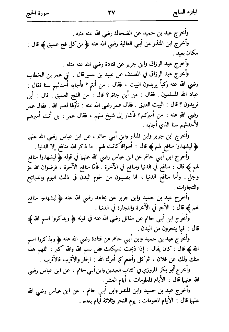وَأخرج ابْن أبي حَاتِم عَن ابْن عَبَّاس رَضِي الله عَنْهُمَا فِي قَوْله {ليشهدوا مَنَافِع لَهُم} قَالَ: مَنَافِع فِي الدُّنْيَا وَمَنَافع فِي الْآخِرَة