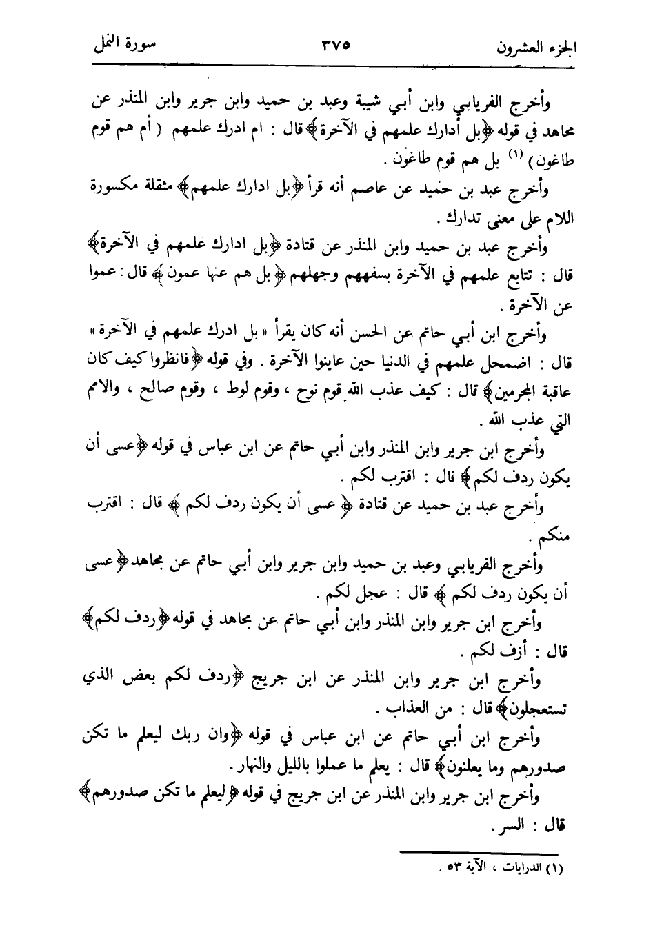 وَأخرج الْفرْيَابِيّ وَابْن أبي شيبَة وَعبد بن حميد وَابْن جرير وَابْن الْمُنْذر عَن مُجَاهِد فِي قَوْله {بل ادارك علمهمْ فِي الْآخِرَة} قَالَ: ام اِدَّرَكَ علمهمْ {أم هم قوم طاغون} الذاريات الْآيَة 53 {بل هم قوم طاغون}