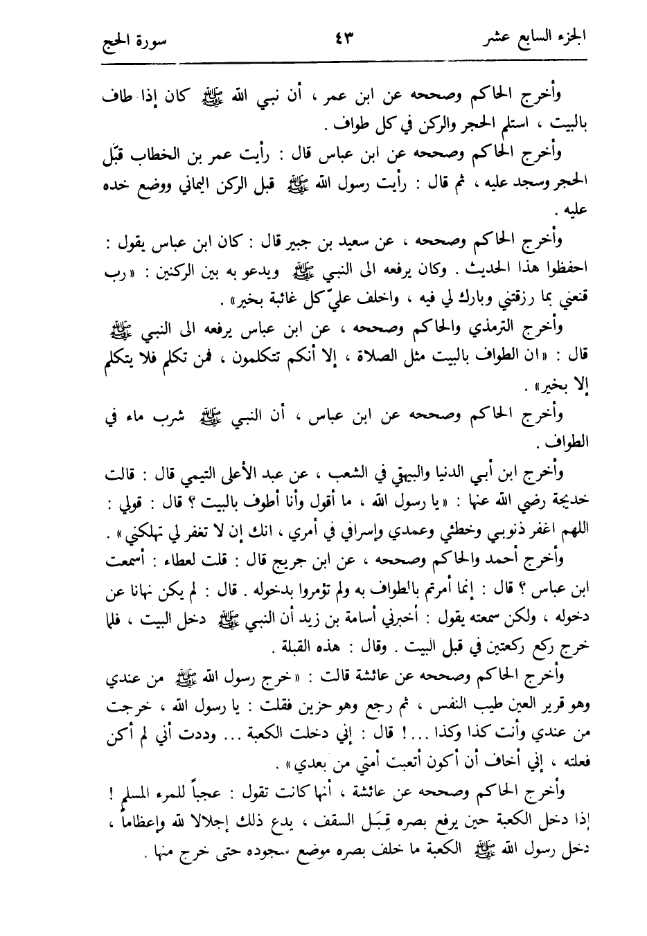 وَأخرج التِّرْمِذِيّ وَالْحَاكِم وَصَححهُ عَن ابْن عَبَّاس يرفعهُ إِلَى النَّبِي صلى الله عَلَيْهِ وَسلم قَالَ: ان الطّواف بِالْبَيْتِ مثلا الصَّلَاة إِلَّا أَنكُمْ تتكلمون فَمن تكلم فَلَا يتَكَلَّم إِلَّا بِخَير