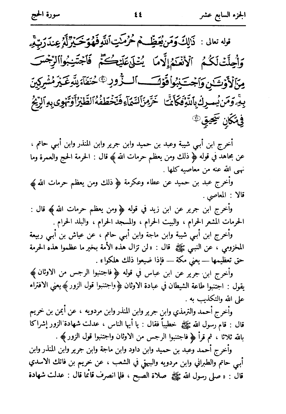 - قَوْله تَعَالَى: ذَلِك وَمن يعظم حرمات الله فَهُوَ خير لَهُ عِنْد ربه وَأحلت لكم الْأَنْعَام إِلَّا مَا يُتْلَى عَلَيْكُم فَاجْتَنبُوا الرجس من الْأَوْثَان وَاجْتَنبُوا قَول الزُّور حنفَاء لله غير مُشْرِكين بِهِ وَمن يُشْرك بِاللَّه فَكَأَنَّمَا خرّ من السَّمَاء فتخطفه الطير أَو تهوي بِهِ الرّيح فِي مَكَان سحيق