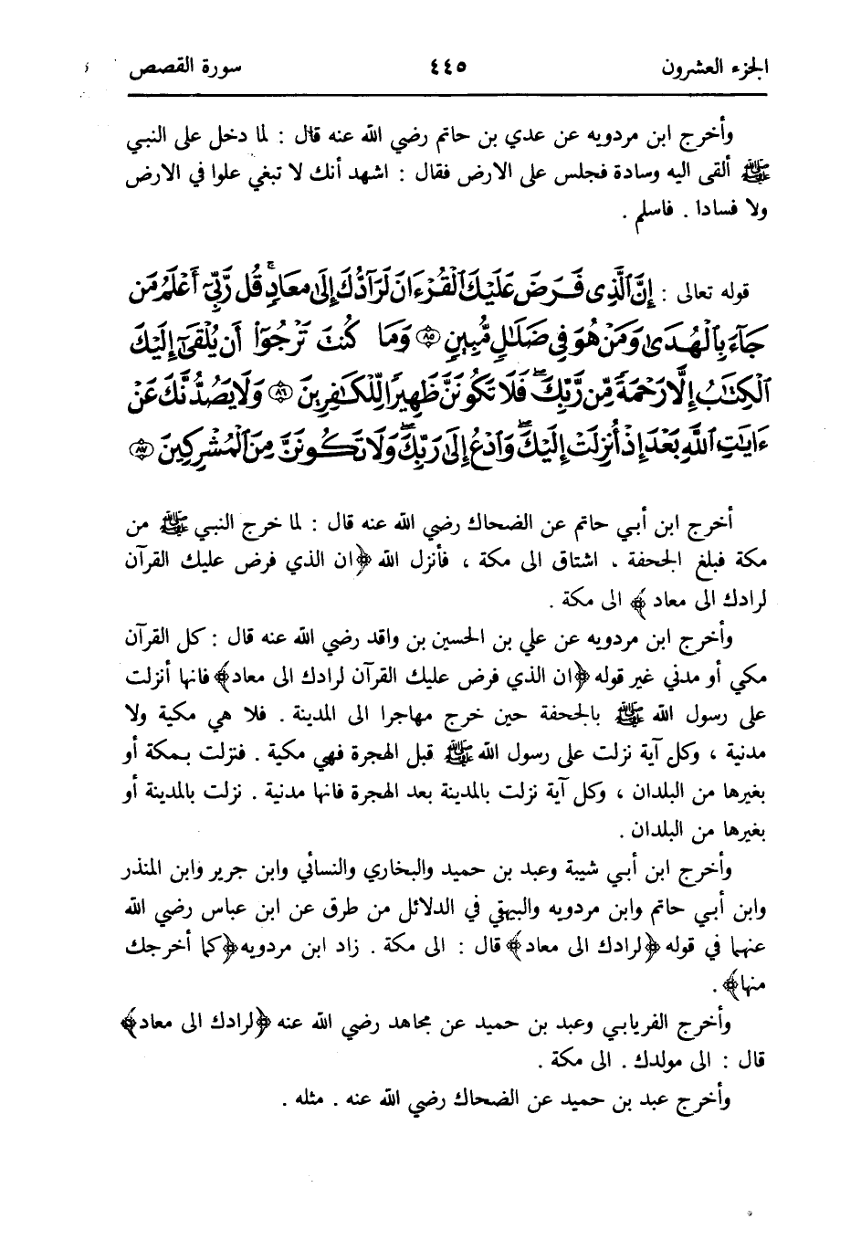 - قَوْله تَعَالَى: إِن الَّذِي فرض عَلَيْك الْقُرْآن لرادك إِلَى معاد قل رَبِّي أعلم من جَاءَ بِالْهدى وَمن هُوَ فِي ضلال مُبين وَمَا كنت ترجوا أَن يلقى إِلَيْك الْكتاب إِلَّا رَحْمَة من رَبك فَلَا تكونن ظهيرا للْكَافِرِينَ وَلَا يصدنك عَن آيَات الله بعد إِذْ أنزلت إِلَيْك وادع إِلَى رَبك وَلَا تكونن من الْمُشْركين