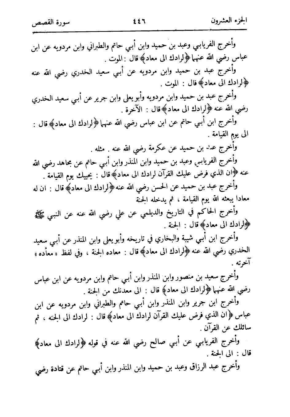 وَأخرج ابْن جرير وَابْن الْمُنْذر وَابْن أبي حَاتِم وَالطَّبَرَانِيّ وَابْن مرْدَوَيْه عَن ابْن عَبَّاس {إِن الَّذِي فرض عَلَيْك الْقُرْآن لرادك إِلَى معاد} قَالَ: لرادك إِلَى الْجنَّة ثمَّ سَائِلك عَن الْقُرْآن