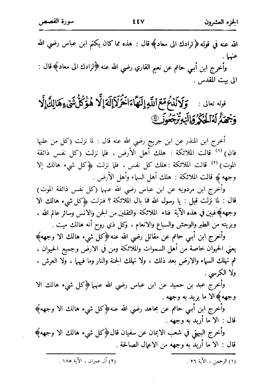 أخرج ابْن الْمُنْذر عَن ابْن جريج رَضِي الله عَنهُ قَالَ: لما نزلت {كل من عَلَيْهَا فان} الرَّحْمَن الْآيَة 26 قَالَت الْمَلَائِكَة: هلك أهل الأَرْض فَلَمَّا نزلت {كل نفس ذائقة الْمَوْت} آل عمرَان الْآيَة 18 قَالَت الْمَلَائِكَة: هلك كل نفس فَلَمَّا نزلت {كل شَيْء هَالك إِلَّا وَجهه} قَالَت الْمَلَائِكَة: هلك أهل السَّمَاء وَأهل الأَرْض