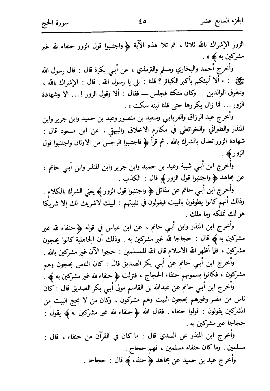 وَأخرج ابْن الْمُنْذر وَابْن أبي حَاتِم عَن ابْن عَبَّاس فِي قَوْله {حنفَاء لله غير مُشْرِكين بِهِ} قَالَ: حجاجاً لله غير مُشْرِكين بِهِ