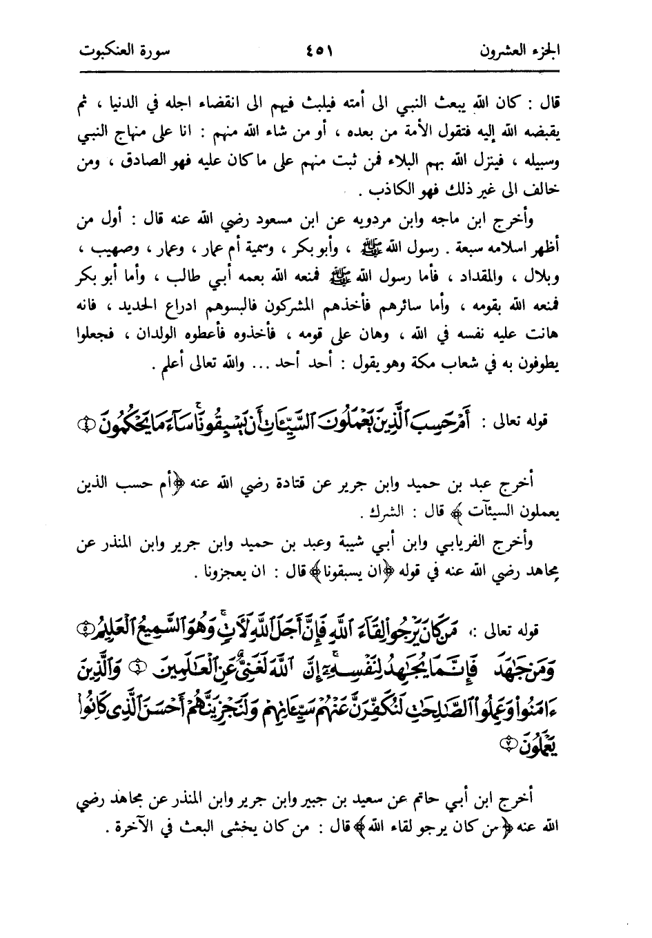 - قَوْله تَعَالَى: من كَانَ يَرْجُو لِقَاء الله فَإِن أجل الله لآت وَهُوَ السَّمِيع الْعَلِيم وَمن جَاهد فَإِنَّمَا يُجَاهد لنَفسِهِ إِن الله لَغَنِيّ عَن الْعَالمين وَالَّذين آمنُوا وَعمِلُوا الصَّالِحَات لنكفرن عَنْهُم سيئاتهم ولنجزينهم أحسن الَّذِي كَانُوا يعْملُونَ
