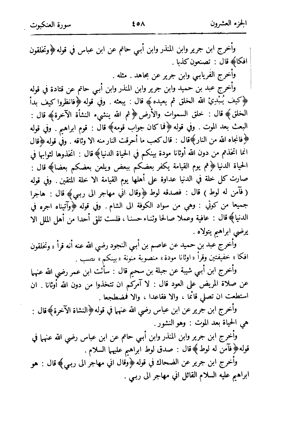 وَأخرج ابْن جرير وَابْن الْمُنْذر وَابْن أبي حَاتِم عَن ابْن عَبَّاس فِي قَوْله {وتخلقون إفكا} قَالَ: تَصْنَعُونَ كذبا