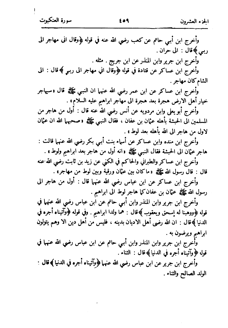 وَأخرج ابْن جرير عَن ابْن عَبَّاس رَضِي الله عَنْهُمَا {وَآتَيْنَاهُ أجره فِي الدُّنْيَا} قَالَ: الْوَلَد الصَّالح وَالثنَاء