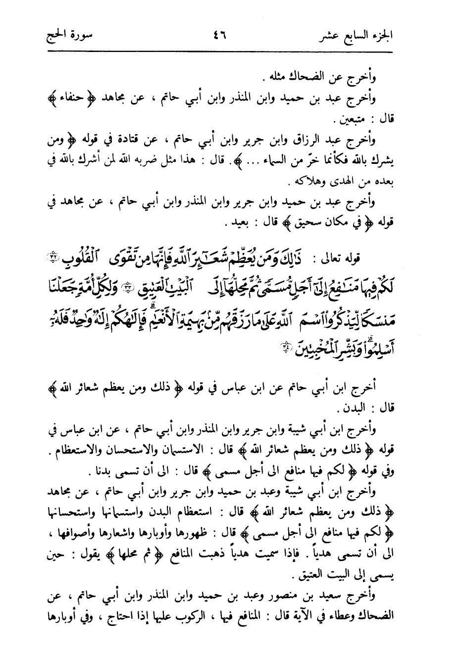أخرج ابْن أبي حَاتِم عَن ابْن عَبَّاس فِي قَوْله {ذَلِك وَمن يعظم شَعَائِر الله} قَالَ: الْبدن