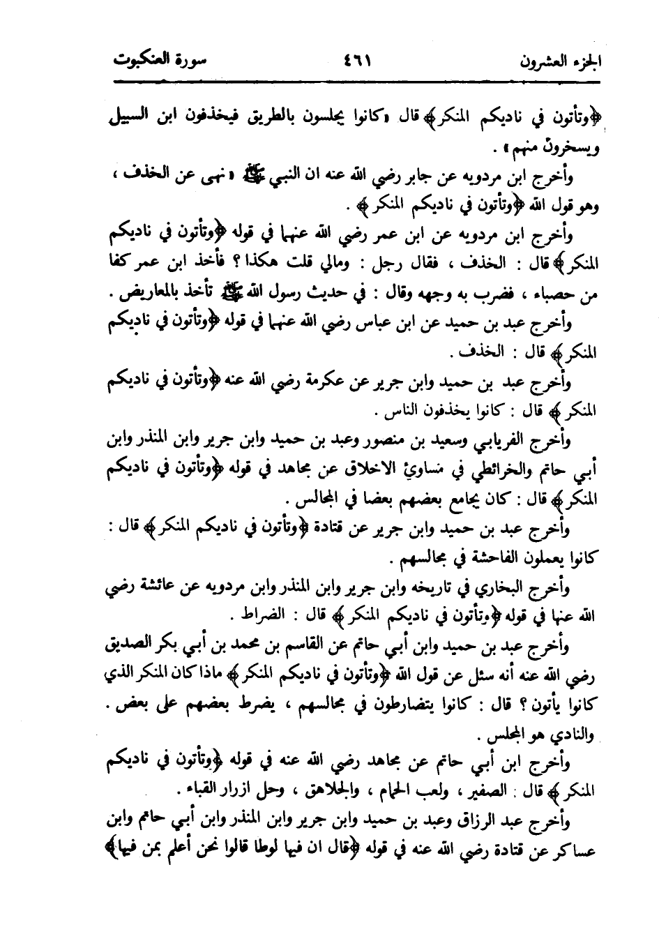 وَأخرج عبد بن حميد وَابْن جرير عَن عِكْرِمَة رَضِي الله عَنهُ {وتأتون فِي ناديكم الْمُنكر} قَالَ: كَانُوا يخذفون النَّاس