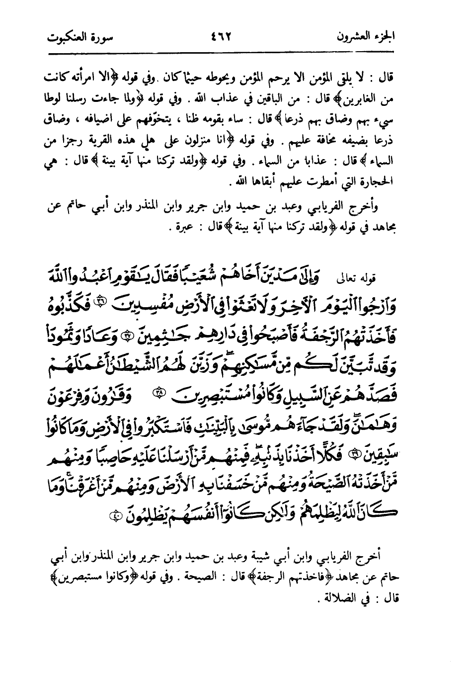 - قَوْله تَعَالَى: وَإِلَى مَدين أَخَاهُم شعيبا فَقَالَ يَا قوم اعبدوا الله وارجوا الْيَوْم الآخر وَلَا تعثوا فِي الأَرْض مفسدين فَكَذبُوهُ فَأَخَذتهم الرجفة فَأَصْبحُوا فِي دَارهم جاثمين وعادا وثمودا وَقد تبين لكم من مساكنهم وزين لَهُم الشَّيْطَان أَعْمَالهم فصدهم عَن السَّبِيل وَكَانُوا مستبصرين وَقَارُون وَفرْعَوْن وهامان وَلَقَد جَاءَهُم مُوسَى بِالْبَيِّنَاتِ فاستكبروا فِي الأَرْض وَمَا كَانُوا سابقين فكلا أَخذنَا بِذَنبِهِ فَمنهمْ من أرسلنَا عَلَيْهِ حاصباً وَمِنْهُم من أَخَذته الصَّيْحَة وَمِنْهُم من خسفنا بِهِ الأَرْض وَمِنْهُم من أغرقنا وَمَا كَانَ الله ليظلمهم وَلَكِن كَانُوا أنفسهم يظْلمُونَ